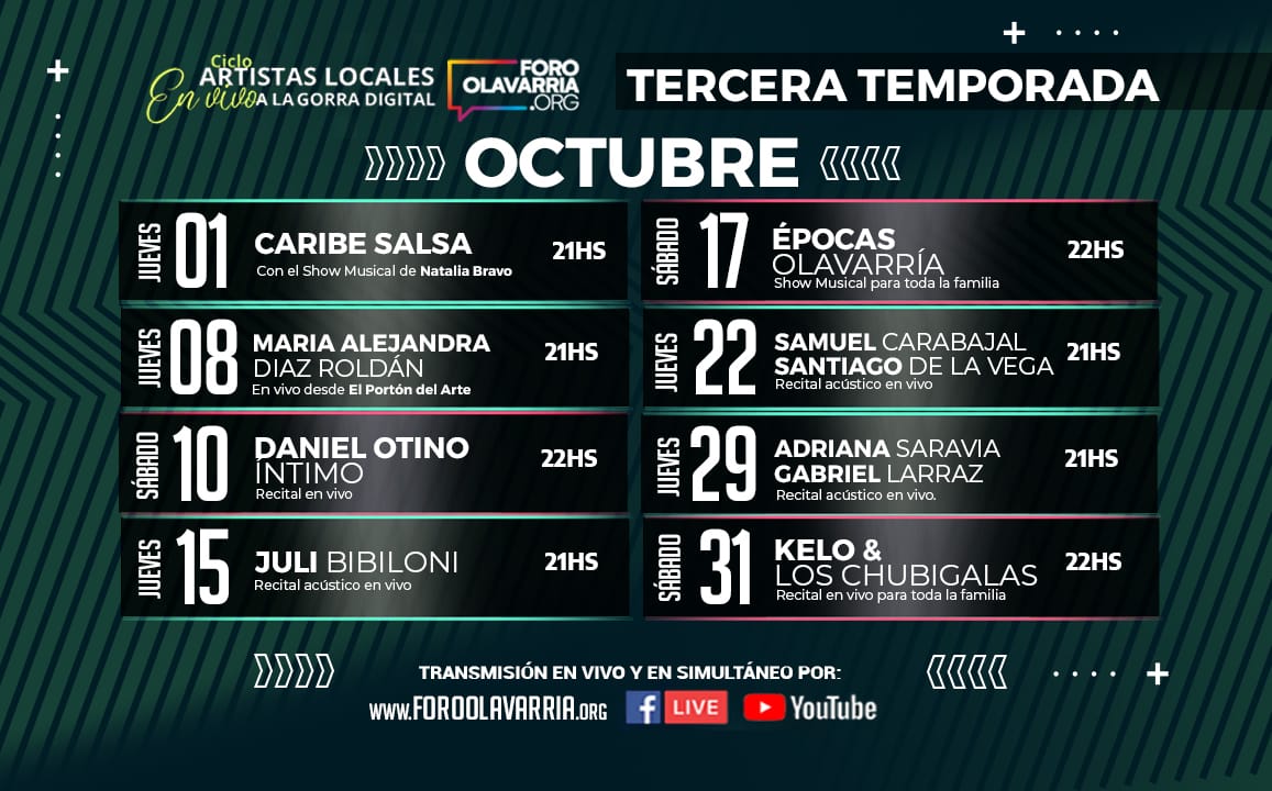 El Foro Olavarría dio a conocer la tercera temporada del exitoso ciclo “Artistas locales en vivo y a la gorra digital” que se cumplirá durante el mes de octubre a través de YouTube y Facebook Live.