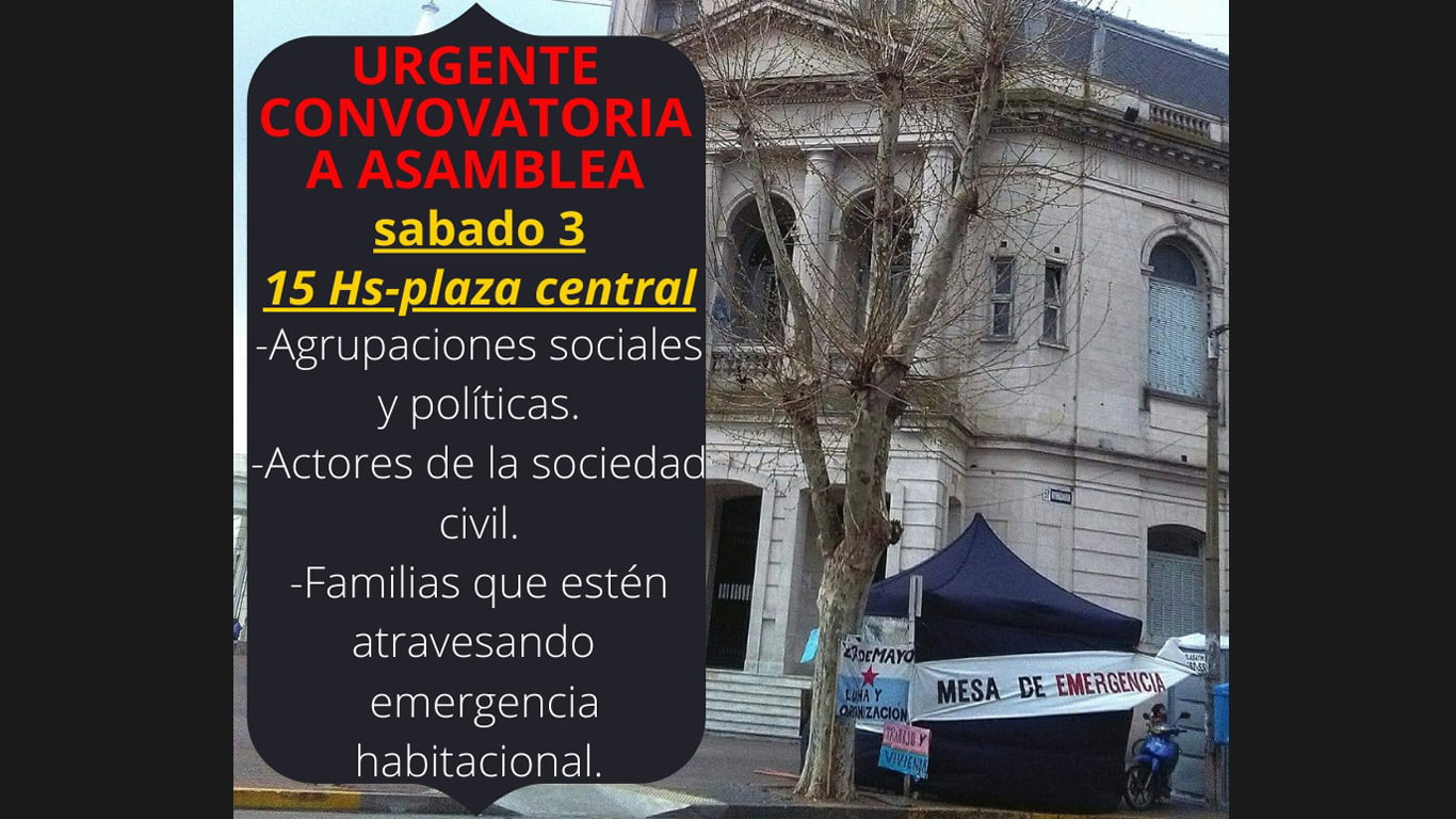 “Es por este motivo que convocamos a organizaciones sociales, políticas, distintos actores de la sociedad civil, y toda aquella familia que estén atravesando por una situación de emergencia habitacional, a una asamblea este sábado 3 de octubre a las 15 horas, en la plaza central”, se añadió.
