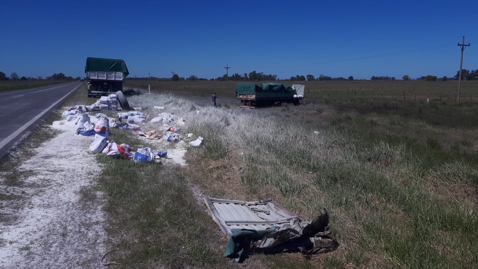 En el siniestro resultaron involucrados dos camiones, ambos de Olavarría, que circulaban en dirección contraria con sus respectivas cargas. Uno de ellos, cargado con bolsas de harina, procedía de Tres Arroyos y retornaba a Olavarría luego de haber descargado algunas bolsas en Bolívar. El otro, una batea con piedra procedente de la ciudad serrana, se dirigía hacia Pergamino.