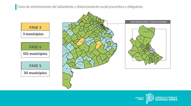 Bolívar, Rauch y Colón se mantienen en Fase 3. En tanto, cuatro distritos pasaron a la Fase 4: Ameghino, Rivadavia, Tornquist y Tres Lomas. Olavarría se mantiene en esa fase. En Fase 5 hay tres nuevos distritos: Alvear, Dorrego y Carlos Tejedor.