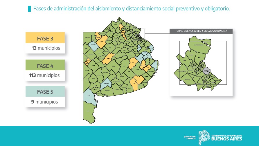 En este contexto, se comunicó la actualización del mapa de ubicación en el sistema de etapas de aislamiento y distanciamiento por la pandemia de coronavirus. Las autoridades provinciales informaron los distritos que cayeron de fase y los que mejoraron su situación.