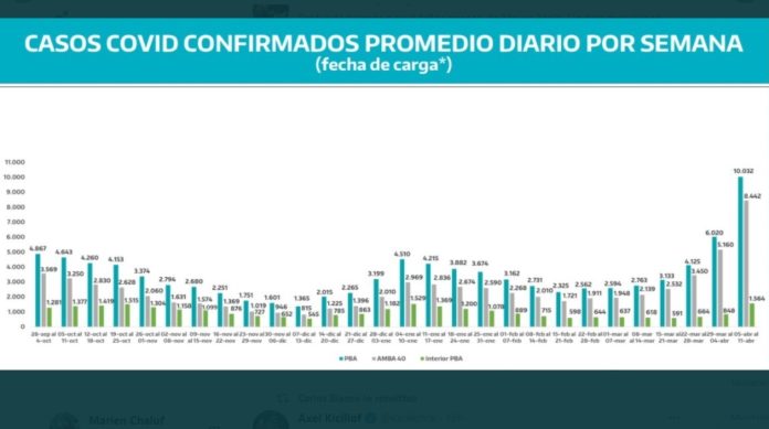 En un gráfico que publicó en ese mismo posteo, el funcionario remarcó que los casos confirmados diarios por semana en territorio bonaerense fueron 10.032 entre el 5 y el 11 de abril.