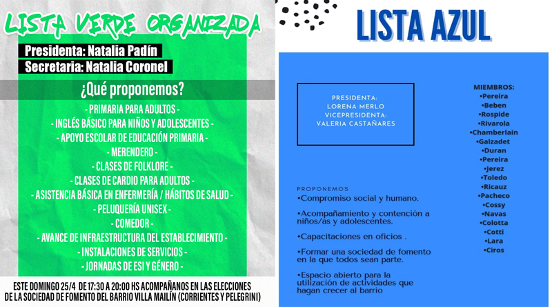 En la tarde de este domingo se llevará a cabo la elección de las nuevas autoridades de la Sociedad de Fomento del barrio Villa Mailín. Los comicios tendrán como escenario la sede de la entidad barrial, ubicada en el cruce de Corrientes y Pelegrino.