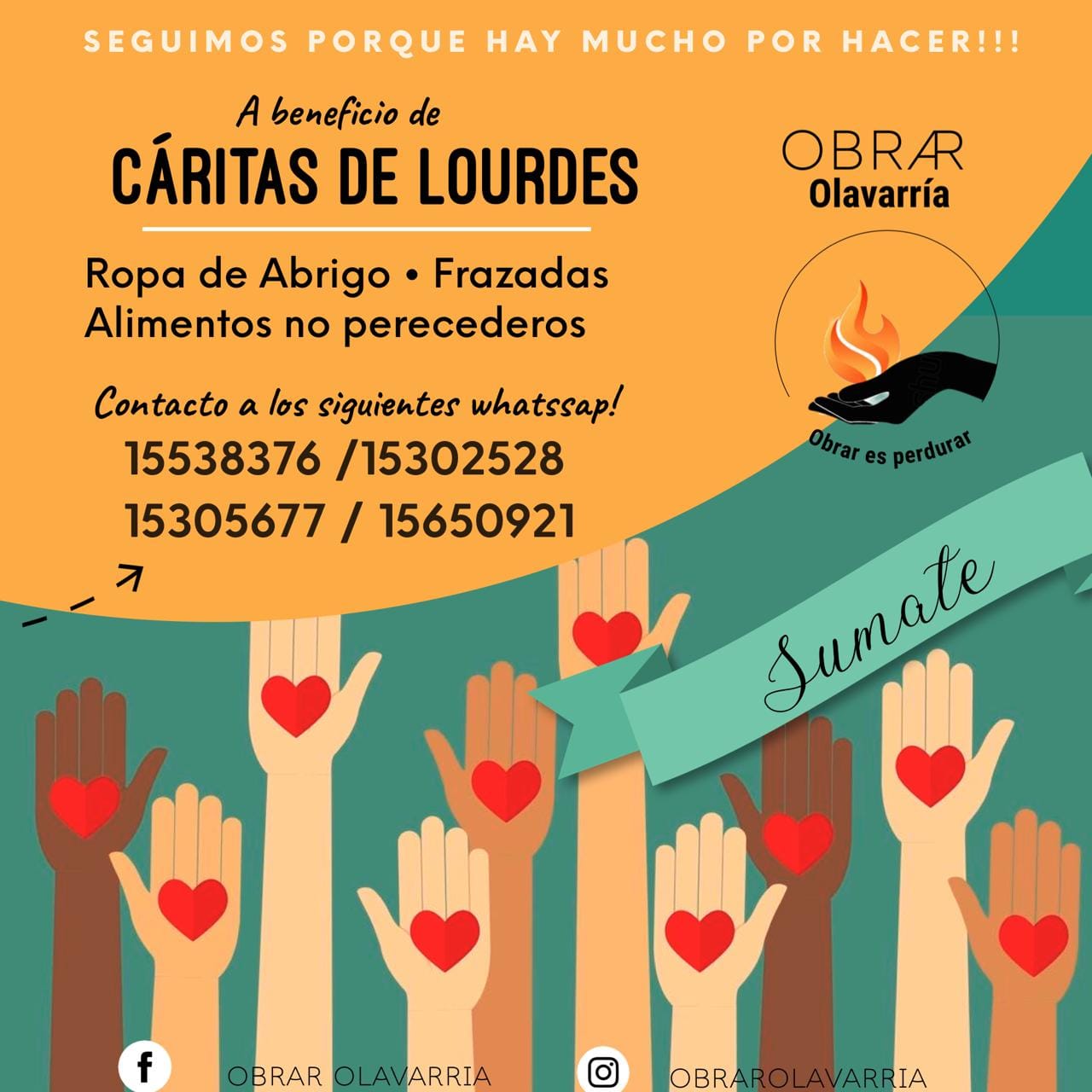 Esta vez, la campaña será para colaborar con Cáritas Lourdes. El pedido principal es de alimentos: “por suerte estamos recaudando mucha ropa y frazadas, estamos muy agradecidos. Sin embargo, hemos recibido muy pocos alimentos no perecederos, por eso estamos reforzando ese pedido. También recibimos dinero que se destinará todo a la compra de alimentos”.