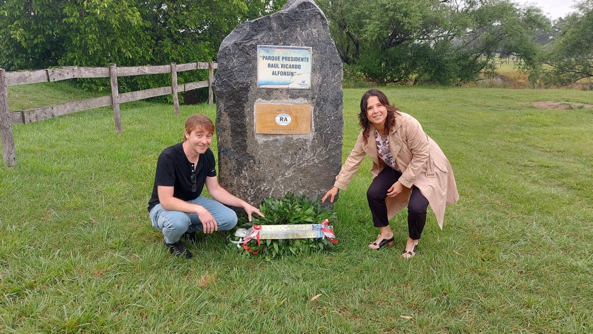 Gonzalo Dolagaray, presidente de la UCR de Olavarría, junto a Belén Vergel, vicepresidente, dejaron una ofrenda floral en la piedra que identifica y recuerda al ex presidente.