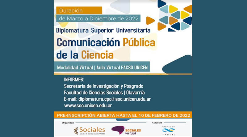 Hasta el 10 de febrero de 2022 estará abierta la inscripción para una nueva edición de la Diplomatura Universitaria Superior en Comunicación Pública de la Ciencia, modalidad virtual, que comenzará a dictarse el 28 de marzo de 2022. Organiza la Facultad de Ciencias Sociales de la Universidad Nacional del Centro de la provincia de Buenos Aires. Se trata de la cuarta edición de la Diplomatura que es organizada por la FACSO y cuenta con el auspicio del Centro Científico Tecnológico CONICET Tandil.