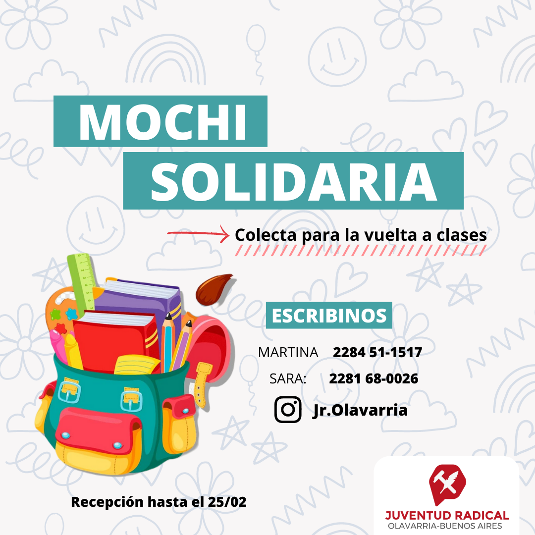“Mochi Solidaria” es la campaña que realiza hace cuatro años la Juventud Radical de Olavarría. Se trata de una colecta de donación de útiles para la vuelta a clases de las infancias. Las donaciones serán derivadas a distintas instituciones así como también a familias particulares que necesiten ayuda para completar la mochila de los niños y niñas.