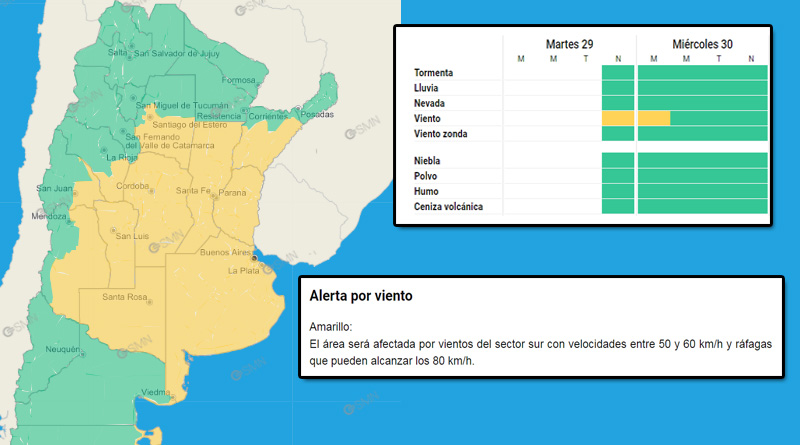 El pronóstico da cuenta que todo se agudizará con el correr de las horas y el arribo de la noche. “El área será afectada por vientos del sector sur con velocidades entre 40 y 50 km/h y ráfagas que pueden alcanzar los 75 km/h”, se detalló. Vale agregar que la advertencia regirá hasta la madrugada de este miércoles inclusive.