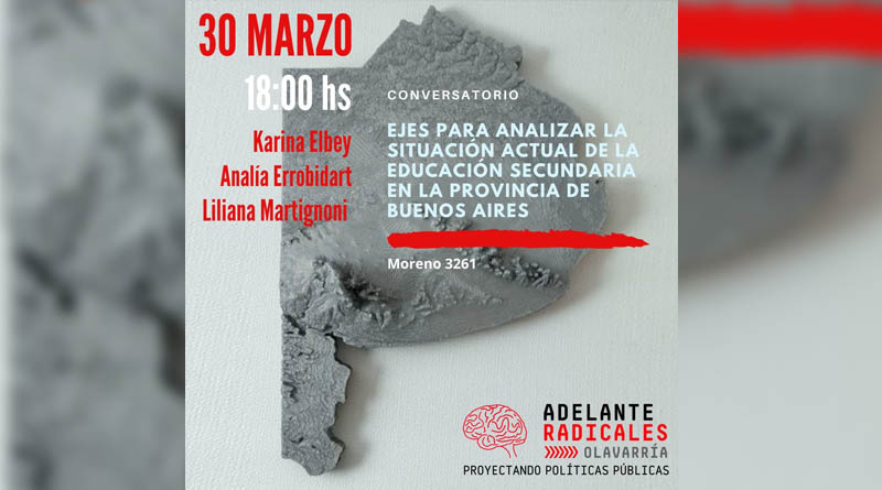 La agrupación Adelante Radicales invita al conversatorio “Ejes para analizar la situación actual de la educación secundaria en la Provincia de Buenos Aires”. La misma se desarrollará en el marco de diversas charlas, exposiciones y conversatorios que se están preparando para este año 2023 con el objetivo de proyectar políticas públicas.