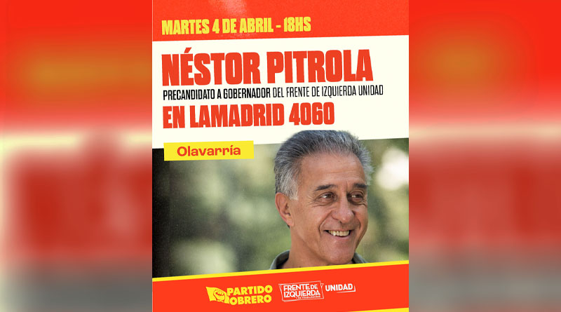 Néstor Pitrola, quien fue dos veces diputado por la Provincia de Buenos Aires, lanzó a finales de febrero su precandidatura a gobernador por el Partido Obrero en el Frente de Izquierda Unidad. Lo hizo acompañado por la fórmula presidencial de esa fuerza, integrada por Gabriel Solano y Romina Del Plá.