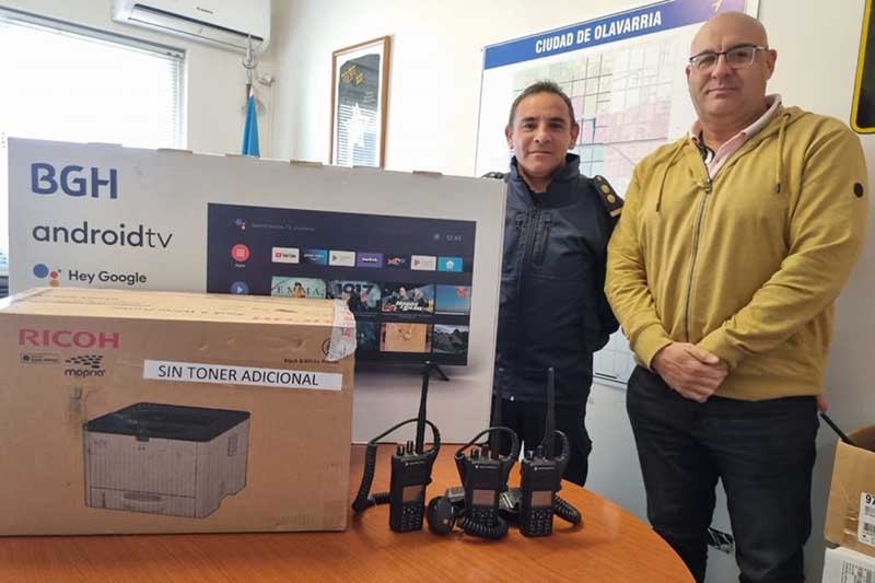 Fue así que el subsecretario de Seguridad Mario Busto hizo entrega, por un lado, de una impresora, handies y un televisor a la Policía Local, lo cual fue recibido por el titular de esa dependencia, el comisario Martín Cortés.