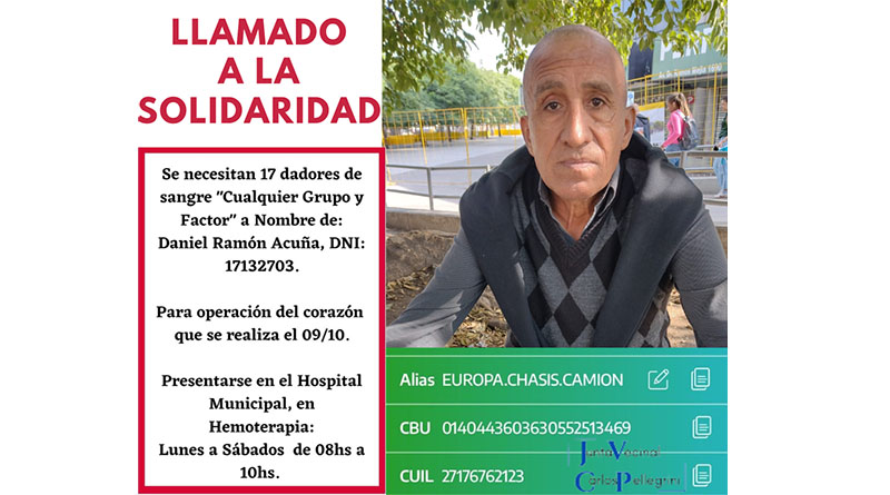 También señalaron que se necesitan 17 donantes de sangre de cualquier grupo y factor. Los interesados pueden acudir al sector de Hemoterapia del Hospital Municipal, de lunes a sábado de 8 a 10, a nombre de Daniel Ramón Acuña.