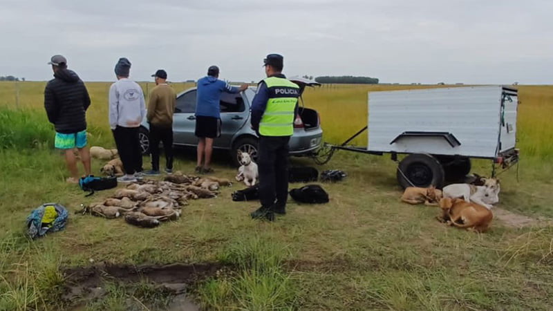 Efectivos de Espigas los aprehendieron en el kilómetro 348 en ruta nacional 226. Se trasladaban en un vehículo con 11 perros y 17 liebres muertas.
