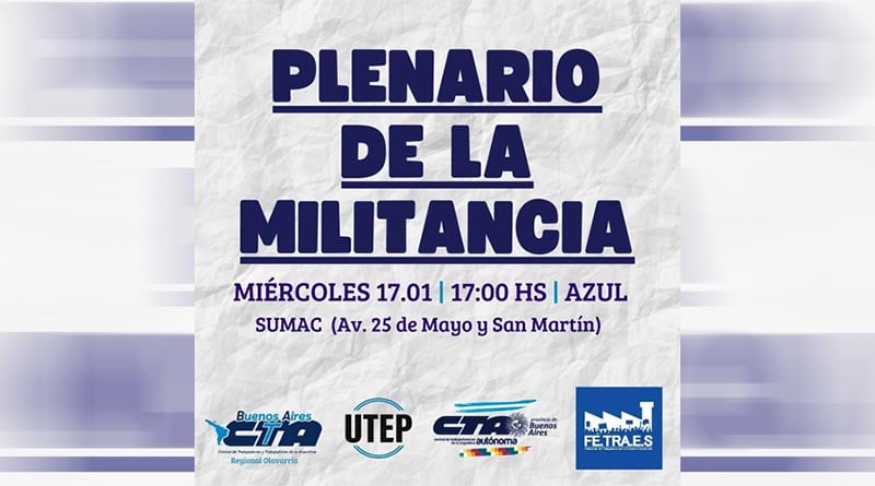 El “Plenario de la militancia” se hará el miércoles por la tarde con convocatoria de referentes de la Séptima Sección de CTA, CTA Autónoma, UTEP y Fetraes.