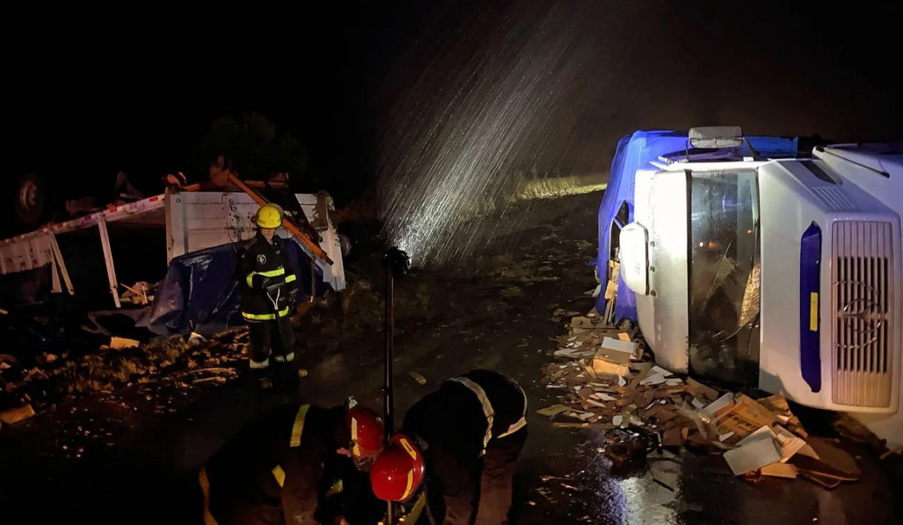 En el lugar, minutos antes de las 4 AM se produjo el vuelco de un camión Mercedes Benz que transportaba cerámicos desde Olavarría hacia Bahía Blanca. Según se informó, afortunadamente el conductor del vehículo no sufrió lesiones.