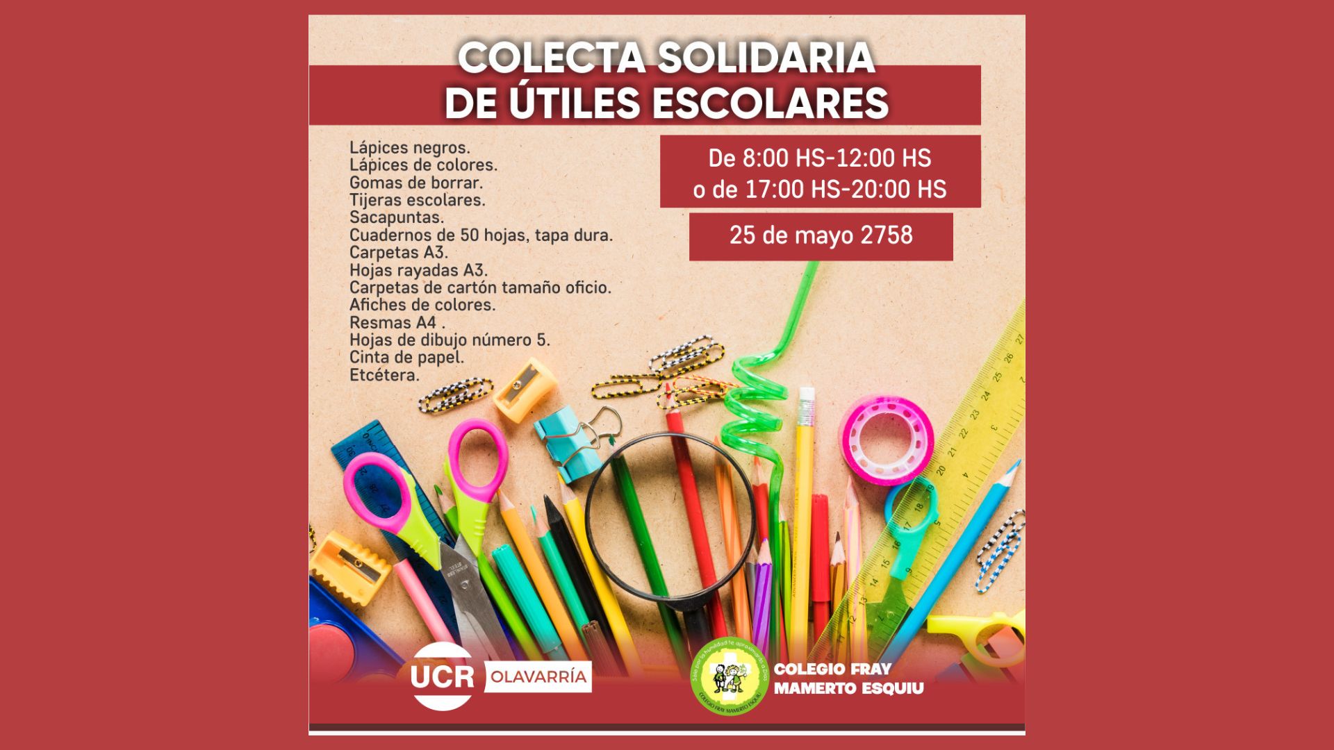 Las personas interesadas en colaborar podrán acercarse al Comité Radical, ubicado en 25 de Mayo 2758, de lunes a viernes de 8 a 12 y de 17 a 20 horas. Lo recaudado será entregado al Colegio Fray Mamerto Esquiú.