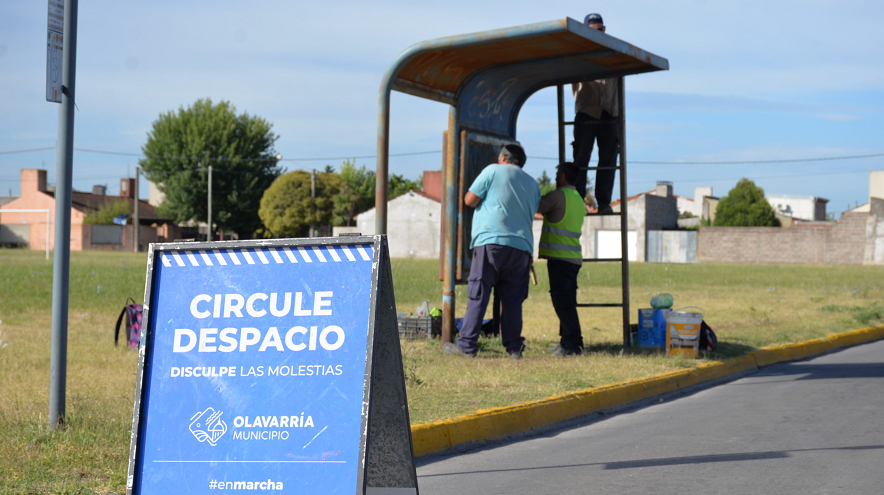 Por otra parte, con una de las cuadrillas municipales dedicadas a tareas de mantenimiento urbano, se llevan adelante tareas de reparación de refugios de colectivos de la línea urbana, en el sector de avenida La Rioja, entre avenida Pueyrredón y avenida Avellaneda, frente al barrio Educadores y Bancario II.
