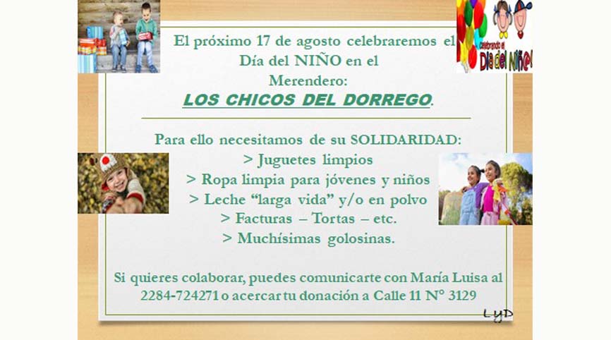Se solicitaron donaciones para el festejo del Día del Niño a realizarse el próximo domingo 17 de agosto en el merendero “Los chicos del Dorrego”.