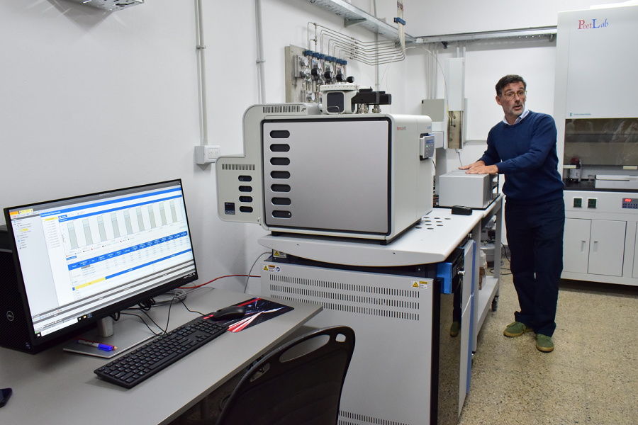 En el laboratorio se encuentra instalado el espectrómetro de masas de razones isotópicas, un equipo de alta tecnología que permite analizar los valores de isótopos estables, esto es, distintas formas de un mismo elemento químico que se preservan en diferentes tejidos orgánicos e inorgánicos.