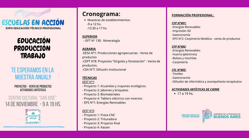 La Expo Educación Técnico Profesional “Escuelas en Acción” se realizará este viernes de 9 a 19 se realizará en el Centro Cultural “San José”.