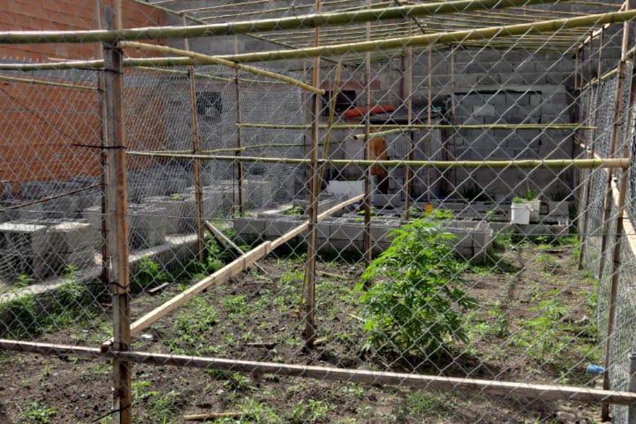 Sobre el terreno del fondo, se encontraron un total de 89 plantas o plantines de marihuana. Algunas de ellas estaban en macetas improvisadas con ladrillos y otras directamente en la tierra dentro de una estructura de hierro de un gran tamaño al estilo de invernadero. Además, se secuestraron, en el patio de la casa, un total de 36 frascos de vidrio que se presumen utilizaban como recipientes para vender la sustancia.