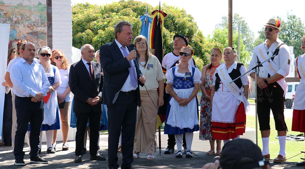 Luego se procedió a entonar los himnos argentino y alemán y brindaron palabras de bienvenida la presidente de la Unión de Colonias Alemanas de Olavarría, Gladys Stoessel, quien en parte de su discurso expresó “su presencia no sólo nos distingue, sino que despierta en nuestra comunidad una emoción especial: la de sentir que a través de Ud. se estrecha nuevamente el vínculo con la tierra de nuestros antepasados”.
