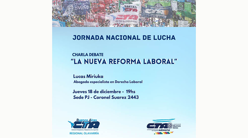 En ese marco, la CTA Regional Olavarría anunció que este jueves desde las 19 se realizará la charla debate “La Nueva Reforma Laboral” con la exposición del abogado Lucas Miriuka, especialista en Derecho Laboral y quien actualmente está al frente de la Delegación Olavarría del Ministerio de Trabajo de la provincia de Buenos Aires.