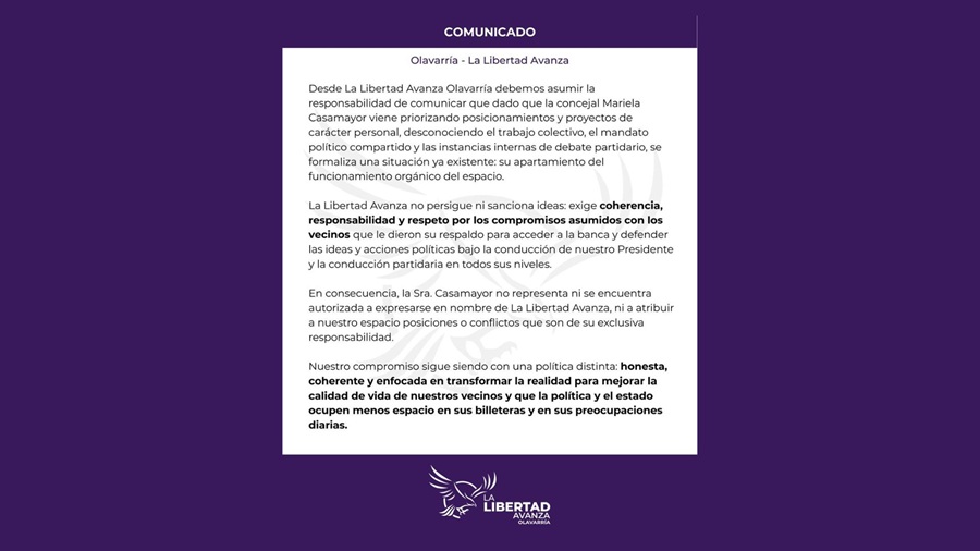 En ese marco, expresaron que “desde La Libertad Avanza Olavarría debemos asumir la responsabilidad de comunicar que dado que la concejal María Adela Casamayor viene priorizando posicionamientos y proyectos de carácter personal, desconociendo el trabajo colectivo, el mandato político compartido y las instancias internas de debate partidario, se formaliza una situación ya existente: su apartamiento del funcionamiento orgánico del espacio”.