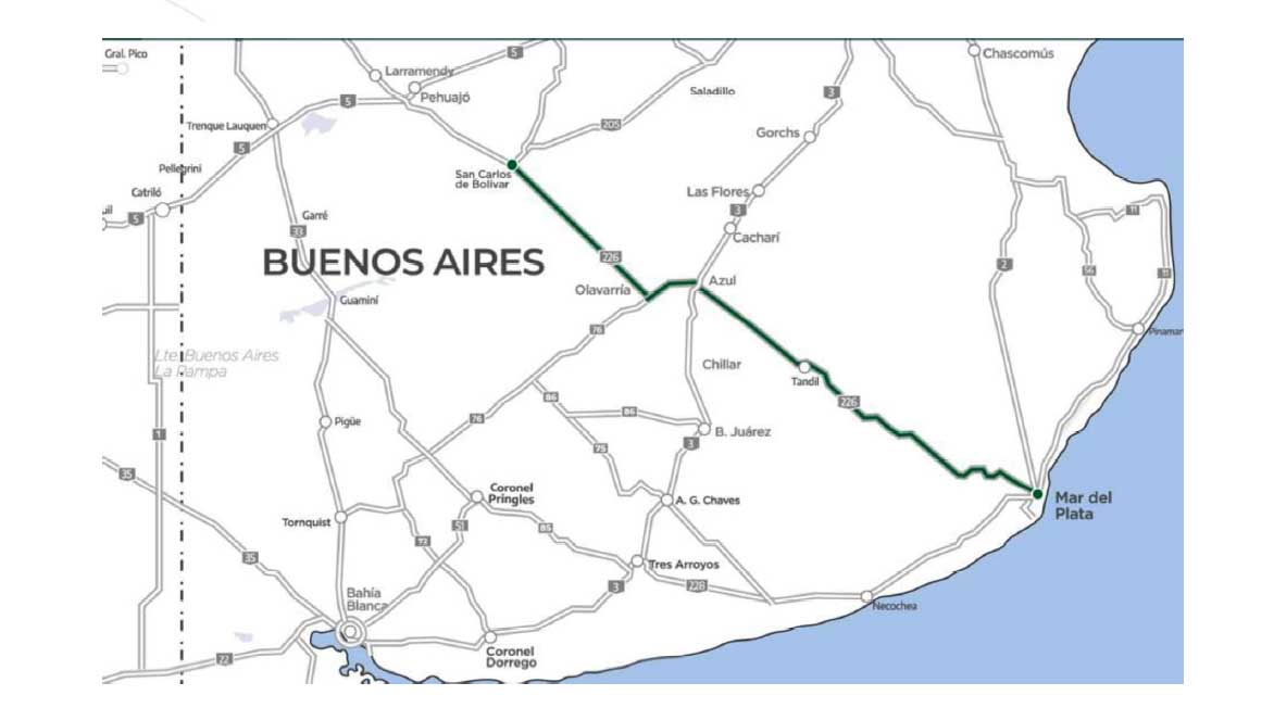 Respecto del “subtramo atlántico” se detalla que la concesión se extenderá por 404,32 kilómetros de la ruta nacional 226 entre el empalme con la ruta provincial 2 en Mar del Plata -kilómetro 0- hasta el empalme con la ruta provincial 65 en Bolívar.