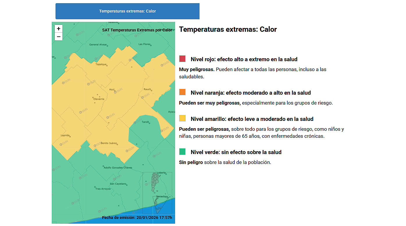 El nivel amarillo implica un “efecto leve a moderado en la salud”. El SMN advirtió que las marcas térmicas pueden ser peligrosas, sobre todo para los grupos de riesgo, como niños y niñas, personas mayores de 65 años, con enfermedades crónicas.
