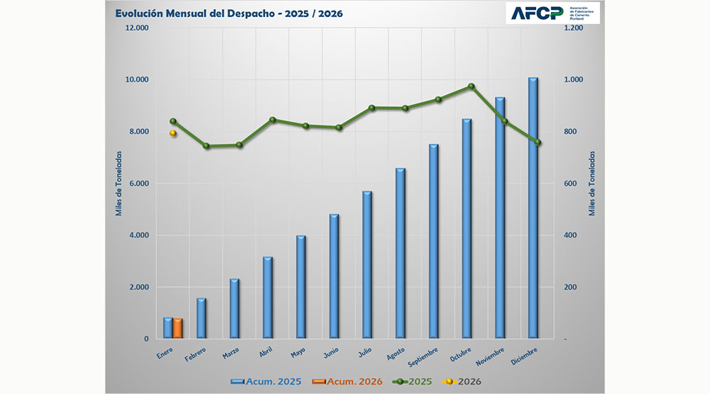 En el primer mes de 2026 se despacharon 792.873 toneladas de cemento en el país, según informó la Asociación de Fabricantes de Cemento Portland (AFCP).