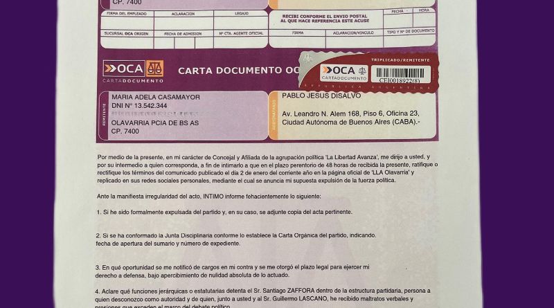 La concejal y afiliada a La Libertad Avanza, María Adela Casamayor, intimó formalmente mediante carta documento al coordinador de la Séptima Sección Electoral del espacio, Pablo Jesús Disalvo, en el marco de un conflicto interno partidario.