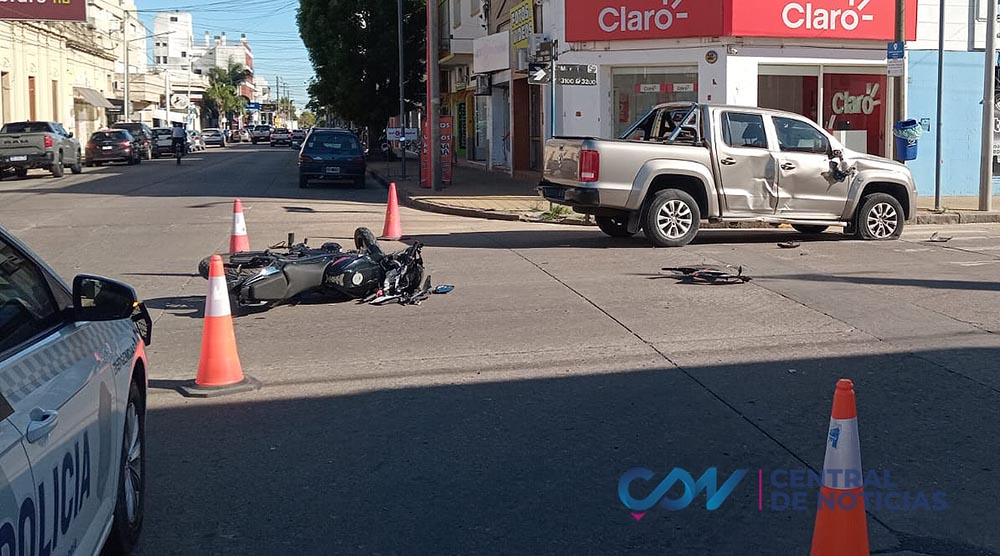 En el cruce de Necochea y Moreno impactaron una camioneta y una moto. Se trató de una Volkswagen Amarok y una Motomel 125 cc.