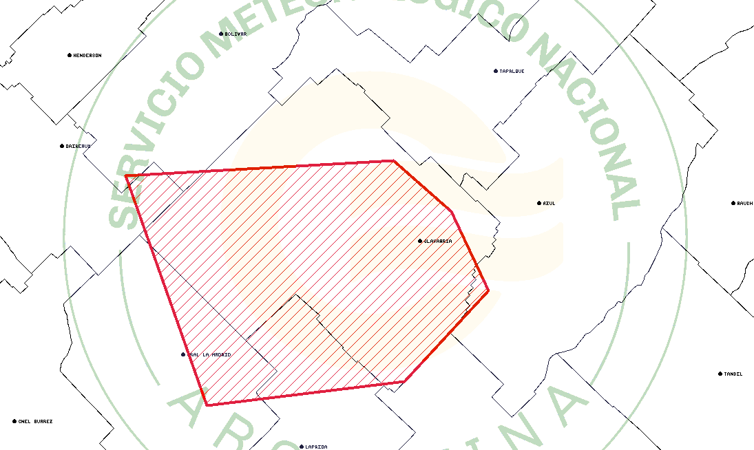 El aviso incluye “tormentas fuertes con lluvias intensas y ocasional caída de granizo” indicó el organismo. El alerta tambièn incluye a Daireaux, General Lamadrid, Laprida, Bolívar, Carlos Casares, Hipólito Yrigoyen,  Pehuajó y Trenque Lauquen.